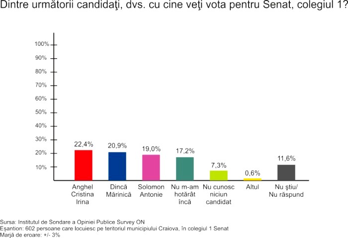 Potrivit sondajului efectuat săptămâna trecută pe un eșantion de 602 persoane cu drept de vot de pe teritoriul municipiului Craiova, peste 64% dintre cei chestionați au declarat că vor merge la vot în 9 decembrie, în timp ce 19% spun că duminica viitoare nu vor călca pragul secțiilor de votare. Craiovenii din colegiul 1 Senat au păreri împărțite când vine vorba de opțiunile de vot pentru mandatul pus la bătaie în acest colegiu. 22,4% dintre craiovenii din colegiul 1 Senat ar vota candidatul USL, Cristiana Irina Anghel, în timp ce 20,9% susțin că ar vota cu Mărinică Dincă, candidatul Alianței România Dreaptă în acest colegiu. Fostul primar al Craiovei, Antonie Solomon, ar obține doar 19% dintre voturile craiovenilor din colegiul 1 care se vor prezenta la urne. Un număr important dintre cei chestionați, peste 17%, susține că nu s-a decis încă în dreptul cărui candidat va pune ștampila, în timp ce alte 7,3 procente au declarat că nu cunosc niciun candidat din colegiul lor. 11,6% dintre cei chestionați au spus că nu știu sau nu vor să răspundă la întrebarea adresată de operatorii Institutului de Sondare a Opiniei Publice Survey ON din Brașov.